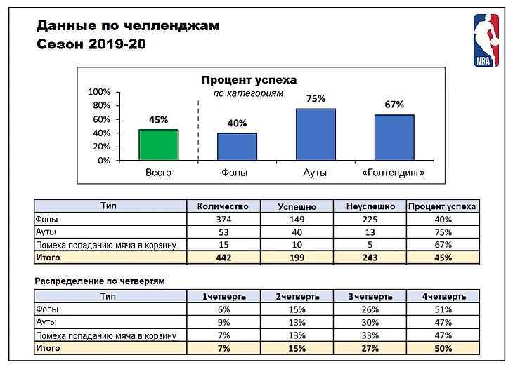 Возможно, в том числе поэтому 75% челленждей аутов и 67% челленджей помех попадания мяча в корзину были успешными. Но в том числе в этих ситуациях проще получить «четкое и определяющее визуальное подтверждение». Поскольку фолы сложнее жестко регламентировать на бумаге, то они всегда частично остаются на усмотрение судей, и они меняют свое изначальное решение всего в 40% случаев. Общий процент «успеха» (45%) ближе к этому показателю, поскольку подавляющее большинство челленджей тренеры берут именно при фолах (374 из 442).