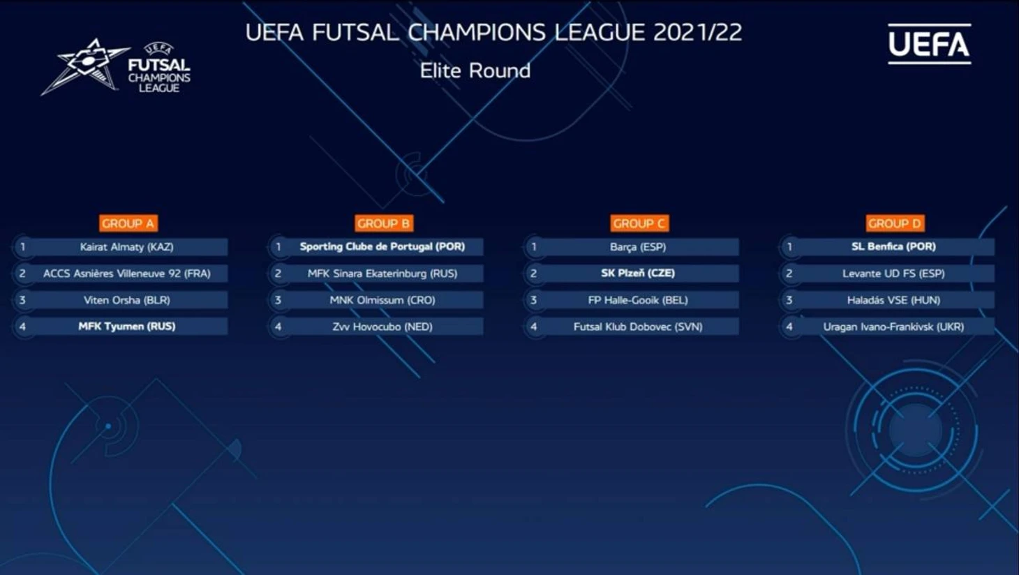 * хозяева групповых турниров элитного раунда Группа А 1. "Кайрат" (Казахстан) 2. "Аньер Вильнёв" (Франция) 3. "Витэн" (Беларусь) 4. "Тюмень" (Россия) * Группа B 1. "Спортинг" (Португалия) * 2. "Синара" (Россия) 3. "Олмиссум" (Хорватия) 4. "Ховокубо" (Нидерланды) Группа С 1. "Барса" (Испания) 2. "Плзень" (Чехия) * 3. "Халле-Гооик" (Бельгия) 4. "Добовец" (Словения) Группа D 1. "Бенфика" (Португалия) * 2. "Леванте" (Испания) 3. "Халадаш" (Венгрия) 4. "Ураган" (Украина)