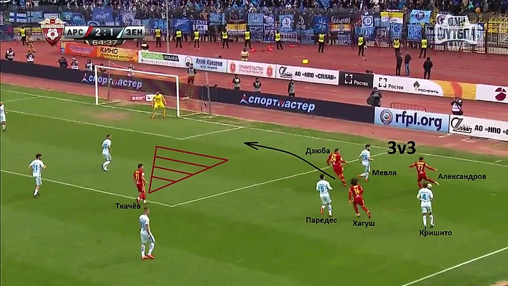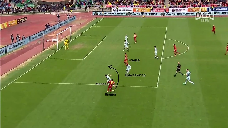 Мевля выдвинулся со своей позиции, чтобы помочь Ивановичу в борьбе с Дзюбой. В результате он лишь открыл дополнительное пространство, куда устремился Артём, а параллельно ему и Кангва.