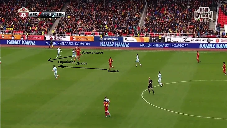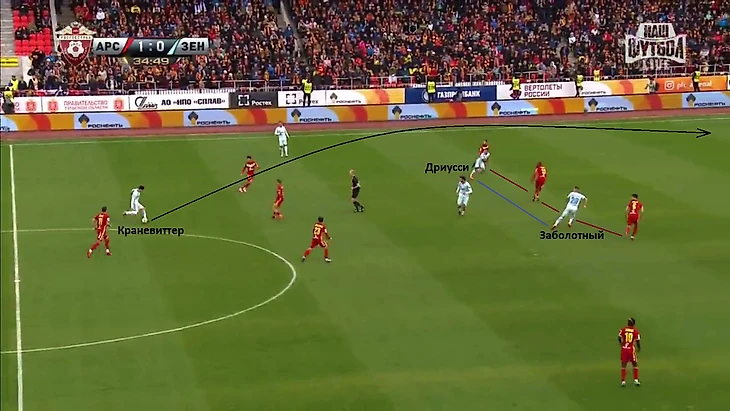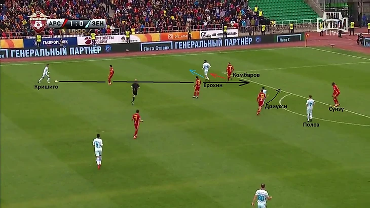 Краневиттер готовит лонгболл за спины защитникам "Арсенала", Дриусси и Заболотный открываются под этот пас. Однако Беляев, Сунзу и Комбаров читают намерения зенитовцев и уже в момент передачи находятся в пол оборота к своим воротам, да еще и втроем устремляются на этот мяч. Естественно, последовала потеря.