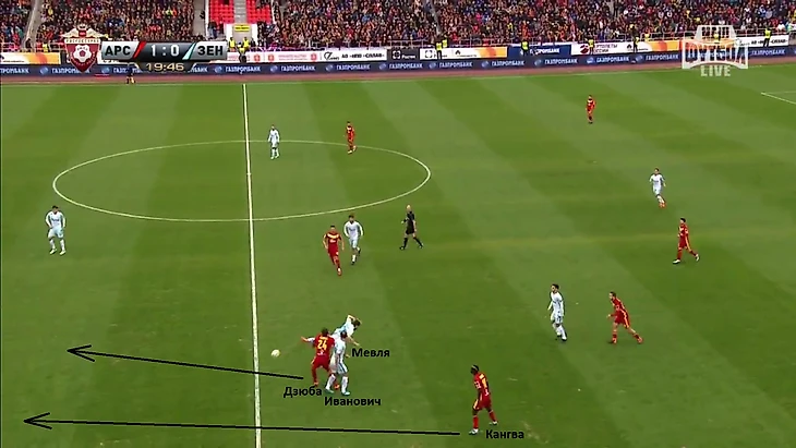 Далее, получив от Дзюбы мяч, Эванс остался 1-в-1 с Мевлей, который не имеет подстраховки. Краневиттер не может выброситься на Кангва, так как у него за спиной Ткачёв. 10 номер "Арсенала" раскачал защитника "Зенита" после чего выдал пас на Ткачёва, который не лучшим образом пробил, однако момент был опаснейший.