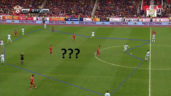 Мистер вновь выпустил Ригони на второй тайм, и вновь эта замена провалилась. Более того, он заменил Краневиттера, который был активнее всех в обороне. После этой замены "Зенит" перешёл на 4-4-2 и вновь мы увидили кромешный ужас первых матчей весенней части. Один скриншот вместо тысячи слов.
