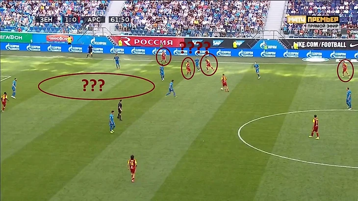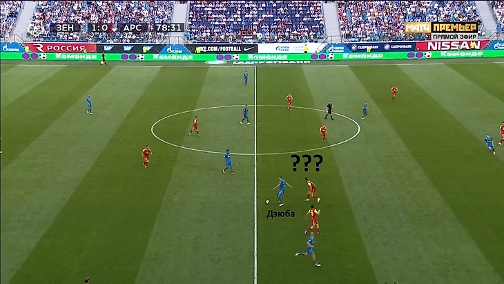 И вот тут у «Зенита» уже начались проблемы. Дело в том, что концепция Семака предполагает использование так называемой ложной десятки. Поднападающий редко опускается за мячом в глубину, в основном стараясь открываться за спины защитникам в момент, когда мяч доходит до вингера, чтобы сразу был вариант для продолжения атаки. Из-за этого все атаки строились по одной и той же схеме, которая, стоит признать, не работала против низкого блока «Арсенала», к которому Кононову пришлось прибегнуть. После того, как мяч доходил до адресата на фланге, вариантов для продвижения его вперёд практически не было.