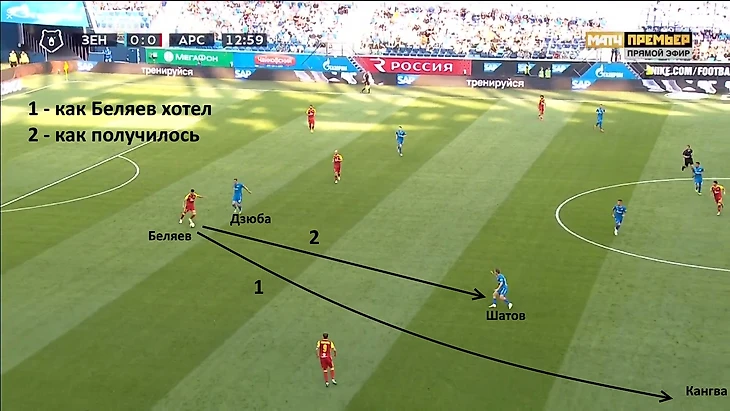 Здесь Дзюба накрывает Беляева, вынуждая его принимать решение быстрее. Максим решает выполнить непростую, но потенциально эффективную, передачу на Кангва, однако, скорее всего из-за давления Дзюбы, обрезает.