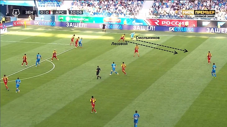Смольников получил мяч на фланге, явного продолжения нет. Лесовой грамотно накрыл его, не дал возможности продвинуться вперёд и, следуя параллельным курсом, выжал назад.