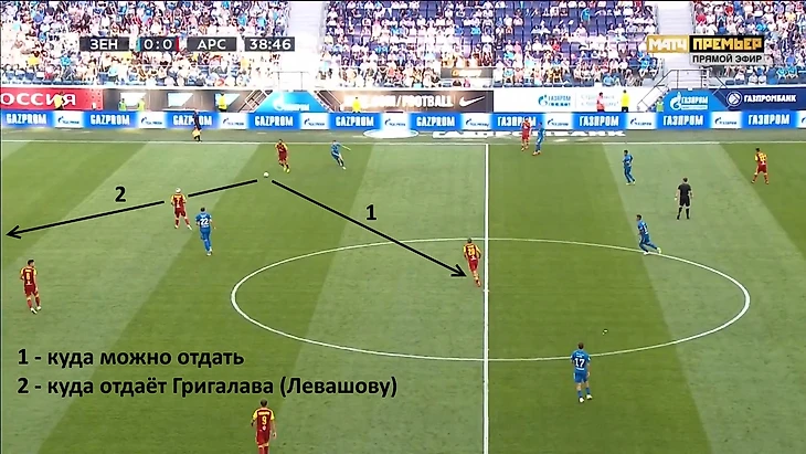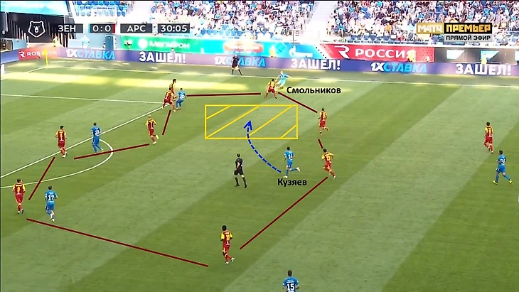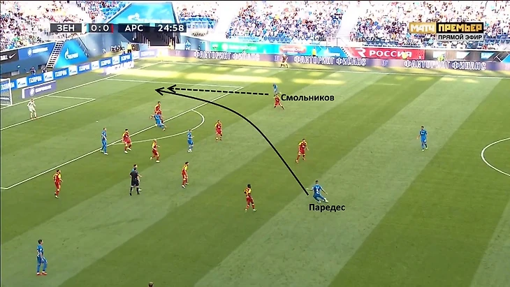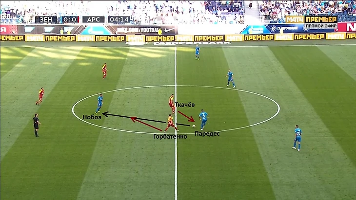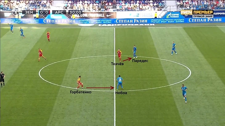 Свой прессинг «Оружейники» акцентировали, естественно, на опорниках «Зенита». Горбатенко, имея изначально более глубокую позицию, должен был находиться за центральной линией, чтобы перекрывать линию передачи на Нобоа, а Ткачёв должен был активно накрывать Паредеса, вынуждая его пасовать назад. Однако вместо этого Игорь зачем-то выдвинулся на Леандро, дезориентировал тем самым Сергея и открыл возможность для передачи.