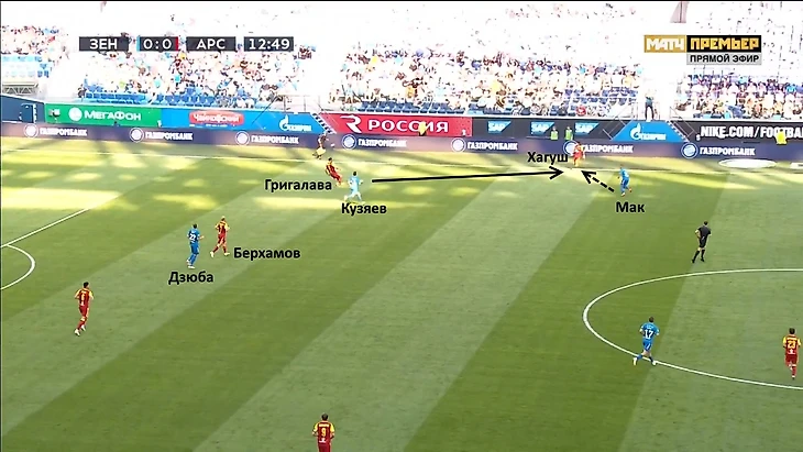 Триггерами прессинга (определёнными действиями, провоцирующими переход в активный отбор) были грамотно выбраны передачи на фуллбэков. Дзюба и Кузяев делают так, чтобы у Григалавы не было иного выбора. Мак сразу, как только увидел пас от Григалавы, выдвинулся на Хагуша с целью перехватить. Вернуть своей команде мяч Роберту не удалось, но своим действием он спровоцировал соперника на пас назад.