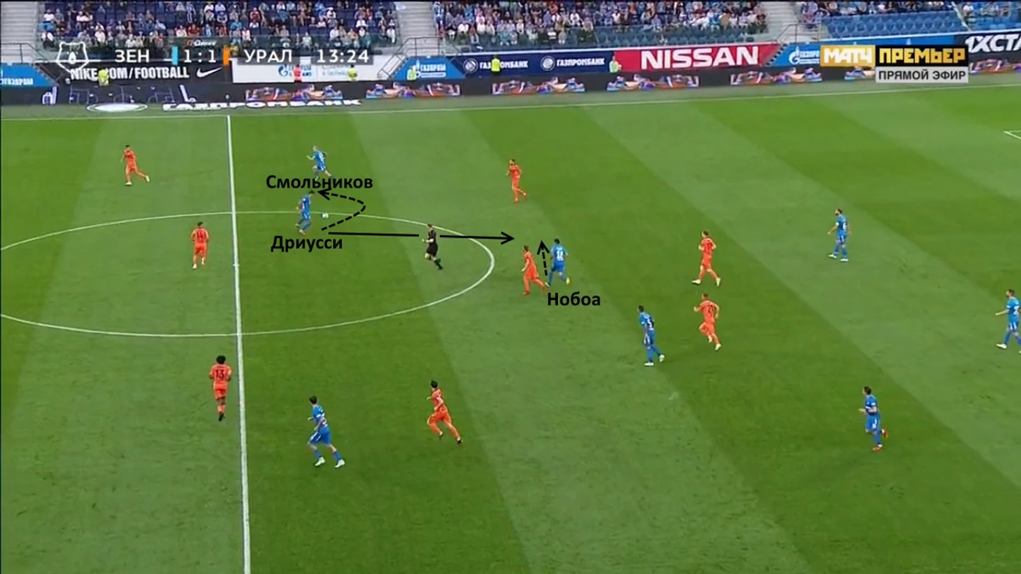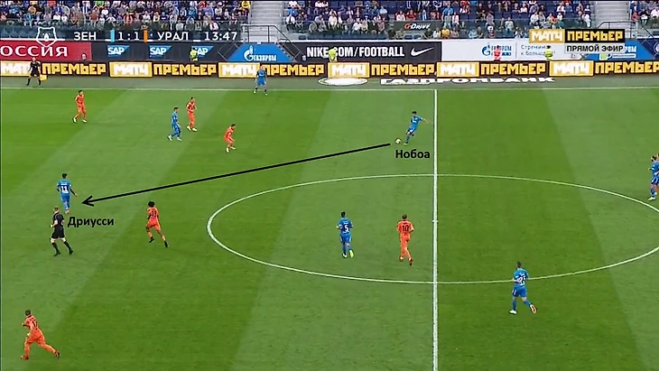 Вместо того, чтобы развернуться с мячом и продолжить атаку через правый фланг, где оказывал поддержку Смольников, Дриусси отдаёт назад на Нобоа. Передача получилась не самой удачной, поскольку эквадорец чуть не потерял мяч.