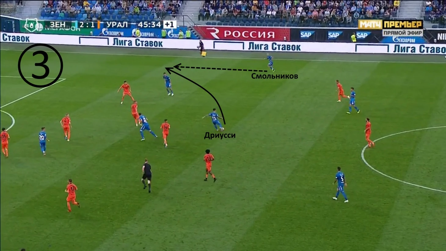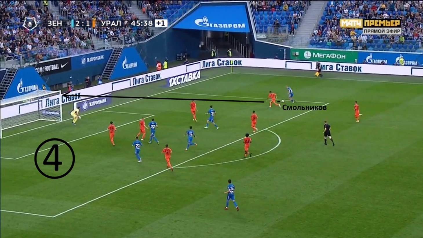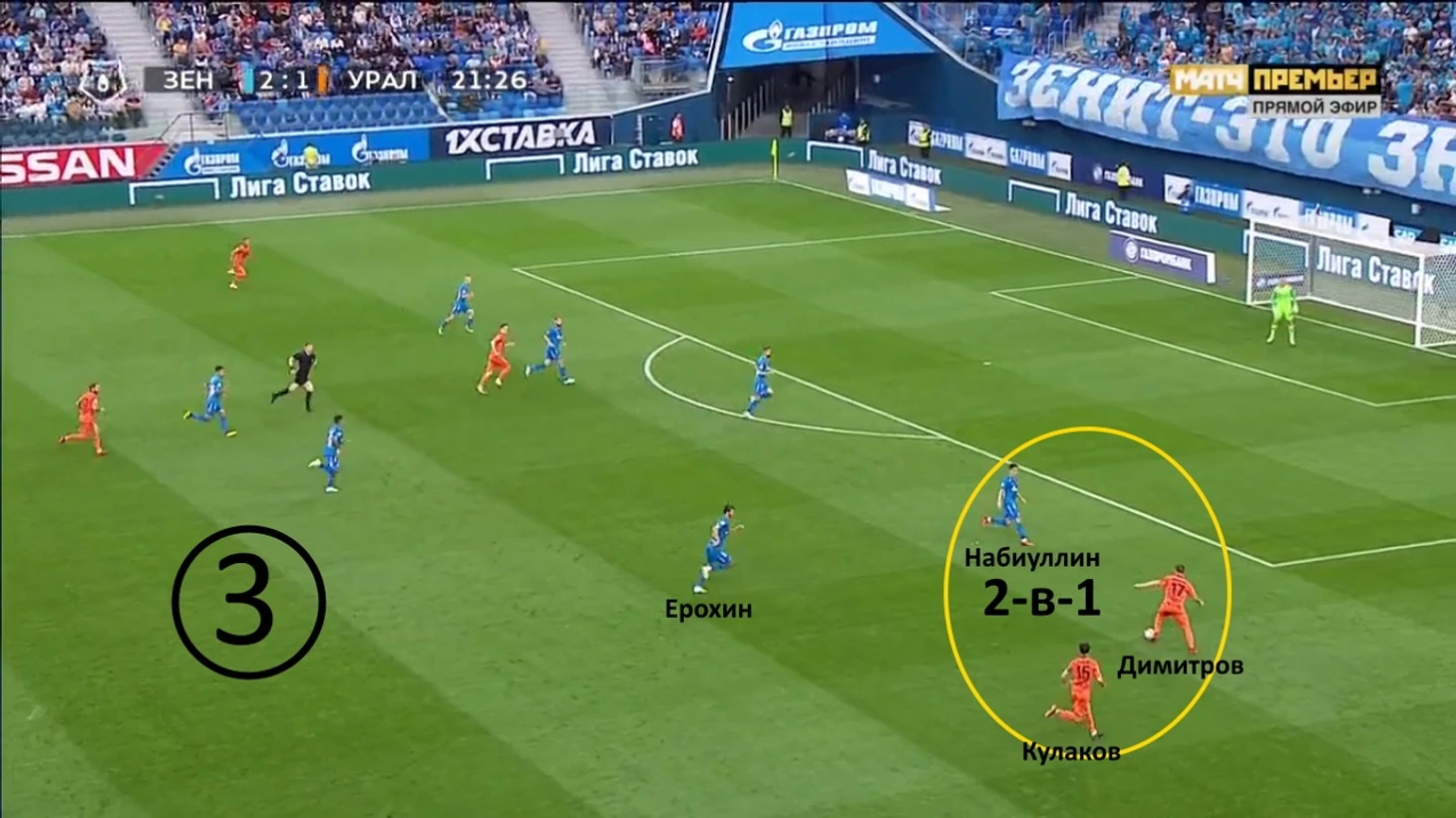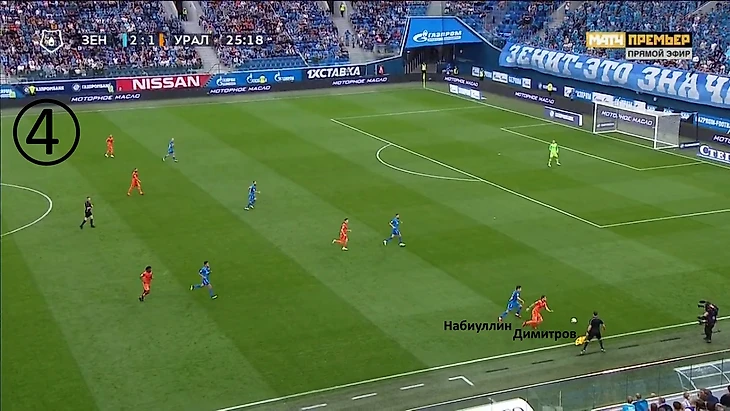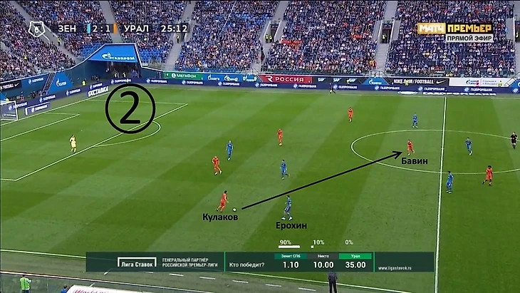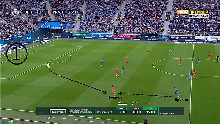 Начало атаки «Урала». «Зенит» отходит назад, готовясь к позиционной обороне, однако Ерохин вдруг решает инициировать прессинг, выдвигаясь на Кулакова.