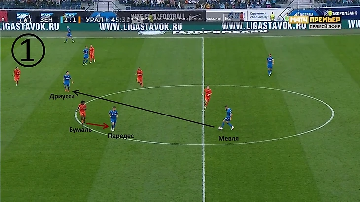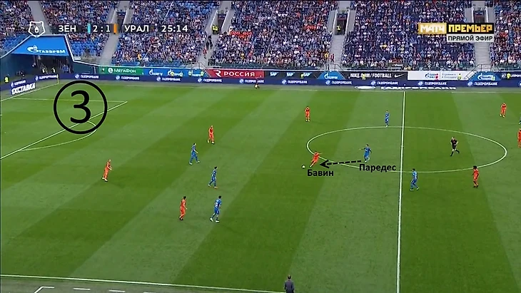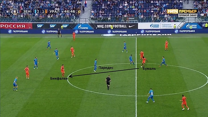 Бикфалви и Димитров накрывают Паредеса, которому остаётся только пасовать назад на Мевлю. Ильин будет накрывать Миху в момент приёма мяча, поэтому словенскому защитнику придётся пасовать на Набиуллина. К сожалению для уральцев, Эльмир всё же смог выбить мяч длинной передачей в центр, но «Зенит» был очень близок к потере.