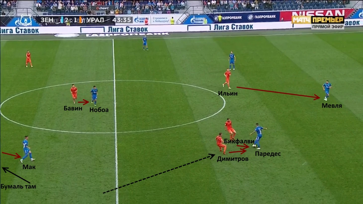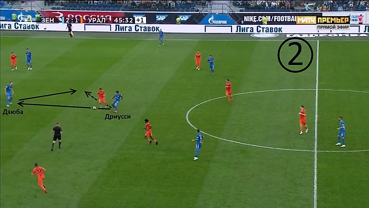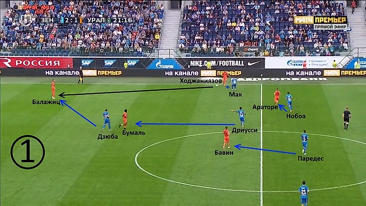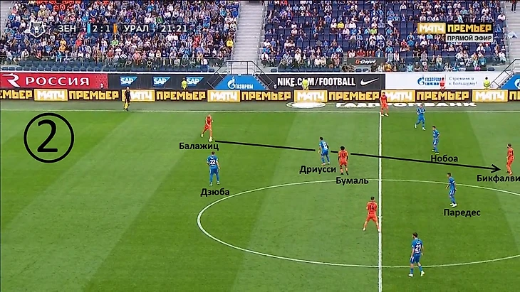 Линия полузащиты располагается достаточно высоко, следовательно, «Зенит» собирается прессинговать. У Ходжаниязова один вариант для передачи – назад на Балажица, так как всех других его партнёров грамотно опекают. Подобные передачи являются сигналом для перехода в активную фазу давления, поэтому Дриусси показывает Дзюбе, чтобы тот выдвигался на Балажица, а сам Себастьян тогда закроет Бумаля.