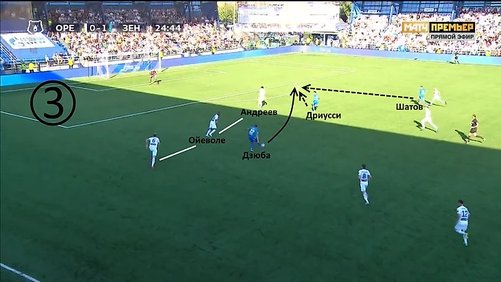 Комбинация пройдёт, благодаря расположению своих партнёров в момент передачи. Дриусси стягивает на себя внимание Бегича (хотя он пытается ориентироваться и на Дзюбу) и Поповича (не так важно в данном эпизоде), Дзюба – Андреева, Шатов – Терехова. Сопровождавший Смольникова Сутормин показывает Терехову, что тот должен продолжить следовать за Игорем. Однако левый вингбэк «Оренбурга» не реагирует, возможно, надеясь, что центральные защитники проконтролируют подключение соперника. Но и они тоже привязаны к другим игрокам, поэтому Смольников принимает заброс от Паредеса в штрафной без сопротивления.