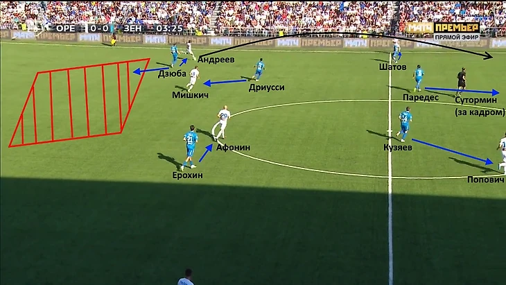 Структура прессинга «Зенита». Дзюба накрывает Андреева, одновременно отрезая ему зону позади. Оба опорника (Афонин и Мишкич), левый вингбэк (Терехов) и инсайды (Сутормин и Попович) контролируются питерцами. В итоге, Андреев попробует отдать верхом на Сутормина, но будет неточен – мяч достанется Ивановичу.