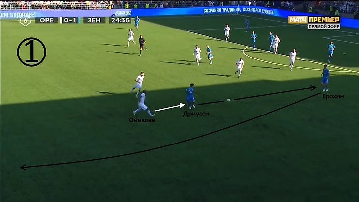 Ойеволе поддерживает попытку контрпрессинга, поднявшись высоко. Дриусси не теряется под давлением, отдаёт на Ерохина, который далее закидывает на ход Дзюбе.