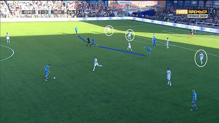 3 игрока «Зенита» находятся почти на одной горизонтальной линии. При этом трое из пяти защитников «Оренбурга» имеют полную свободу: они могут спокойно страховать друг друга, выдвигаться с позиций, чтобы поджимать и т.д. Для стерильного контроля этого достаточно, но для создания моментов – ни в коем случае.