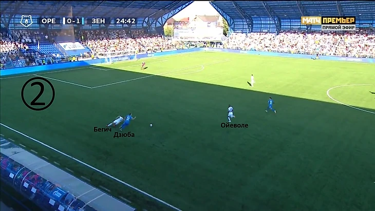 Ближе к концовке тайма «Оренбургу» удалось слегка вернуть себе инициативу. Зенитовцы реже стали прибегать даже к мид-прессингу, предпочитали встречать соперника на своей половине поля. Однако, как мы знаем, в позиционной обороне в низком (или тяготеющем к нему) блоке «Зенит» не так хорош. Тут проявляются и позиционные ошибки опорников, и в целом чувствуется, что система не до конца отлажена – перестроения при переводе мяча, продвижении соперника к воротам характеризуются недостаточной слаженностью. Хозяева поля в таких условиях получили возможность для розыгрыша своих фирменных фланговых комбинаций, которые, правда, до удара доводить не удавалось.