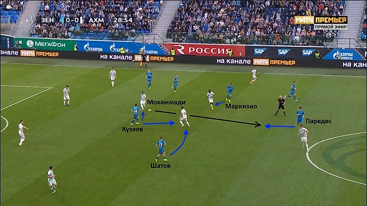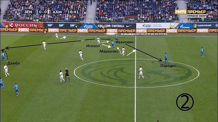 Структура в начальной фазе построения атаки была изменена на 2-1 (два ЦЗ плюс Паредес), однако фланговые защитники опускались достаточно глубоко, чтобы помогать разыгрывать мяч, поэтому её можно трактовать и как 2-3. При 4-2-3-1 со Смольниковым справа в защите «Зенит» выстраивался 2-4, с Ивановичем 3-4. Фактически, можно сказать, что использовавшаяся против «Ахмата» структура более смелая, поскольку задействует меньше игроков в первичной фазе билд-ап’а, но на деле качественных изменений не произошло.