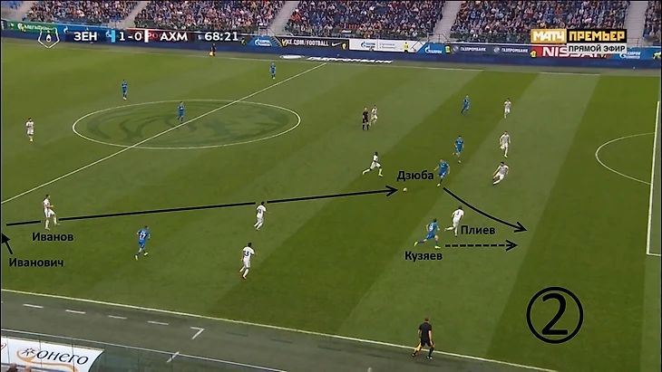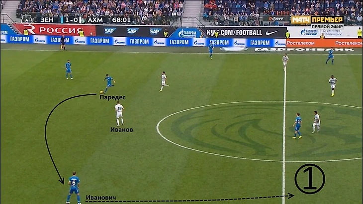 А так Иванович оказался заперт на фланге: игроки «Ахмата» контролируют ближайших к нему партнёров по команде, возможный пас на Паредеса, а также частично и его самого. Это вынуждает Бранислава отдавать вертикальную передачу под рывок Дзюбы, которую уже ждал Анхель. В итоге, венесуэлец просто-напросто выбил мяч в аут.