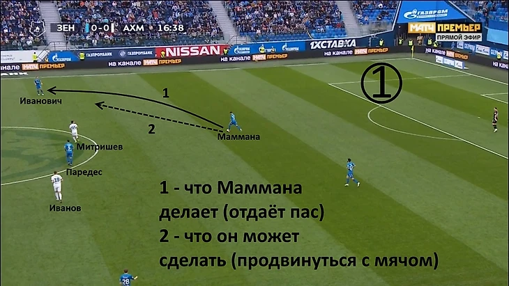 Маммана с мячом, перед ним есть немного свободного пространства, однако вместо продвижения он решает вторым после приёма касанием перевести на Ивановича. Если бы он начал движение в указанном направлении, то мог бы стянуть на себя Митришева, благодаря чему Паредес остался бы 1-в-1 с Ивановым, который ещё и у него за спиной, то есть в выгодной для себя ситуации. Также продвижение Мамманы позволило бы Ивановичу расположиться выше, стянуть на себя Исмаэла, не имея при этом в ногах мяча, за счёт чего Маркизио получил бы больше свободы между линиями.