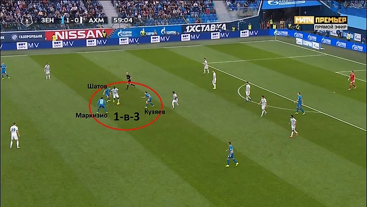 «Ахмат» в привычном для себя стиле встречал «Зенит» на своей половине поля, отдавал полную свободу Маммане и Нету и частичную Паредесу, поскольку акцентировал свой прессинг на восьмёрках – Маркизио и Кузяеве. Центральные защитники питерской команды могли использовать свободные зоны в полуфлангах для продвижения с мячом и последующей передачи в зоны между линиями соперника, но не делали этого, а лишь как можно скорее старались доставить мяч на фланг своему фуллбэку.