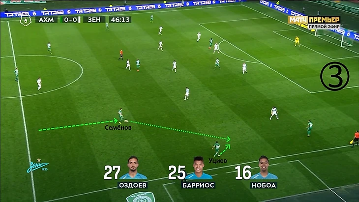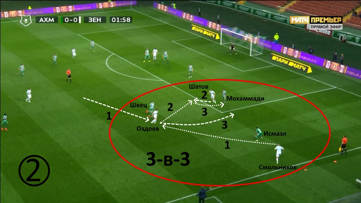 Благодаря этому «Сине-Бело-Голубые» получили 3-в-3 на фланге, которые почти сумели успешно разыграть (пас от Шатова пяткой (№3) под забегание Оздоева (также №3) не прошёл). Если бы Мохаммади мог выдвинуться на Смольникова, то «Ахмат» бы получил дополнительного, четвёртого, игрока в этой зоне в лице левого ЦЗ. Тогда ситуация была бы не так благоприятна для «Зенита», но, благодаря структуре «Сине-Бело-Голубых» в билд-ап’е, этого не произошло.