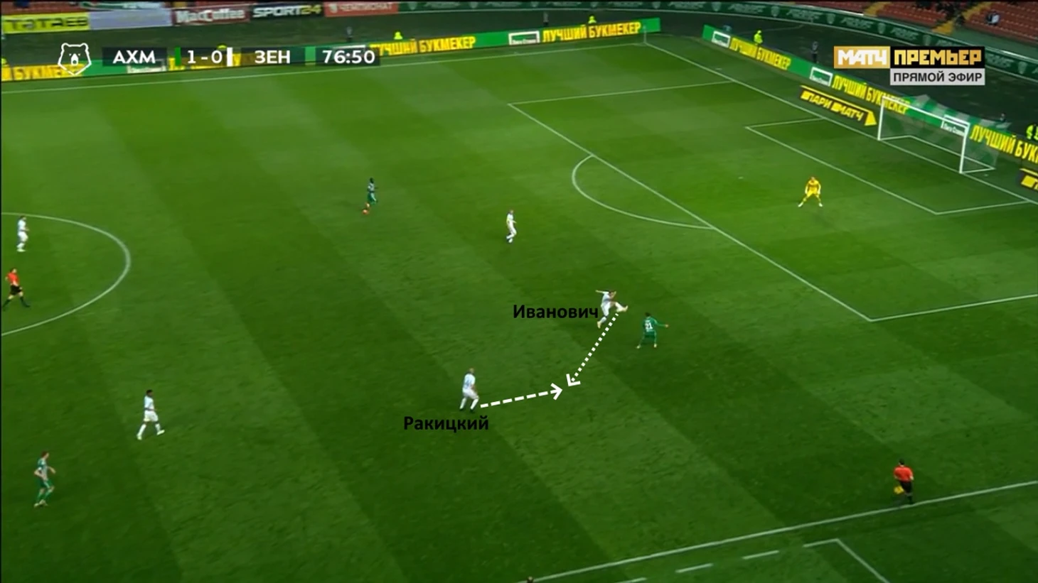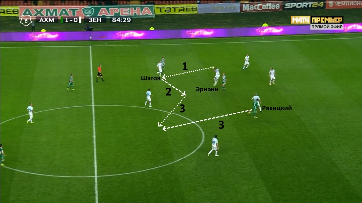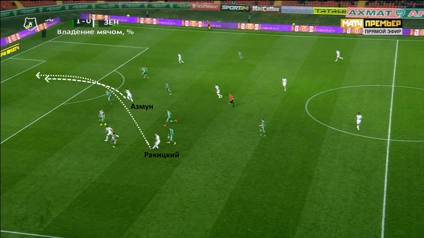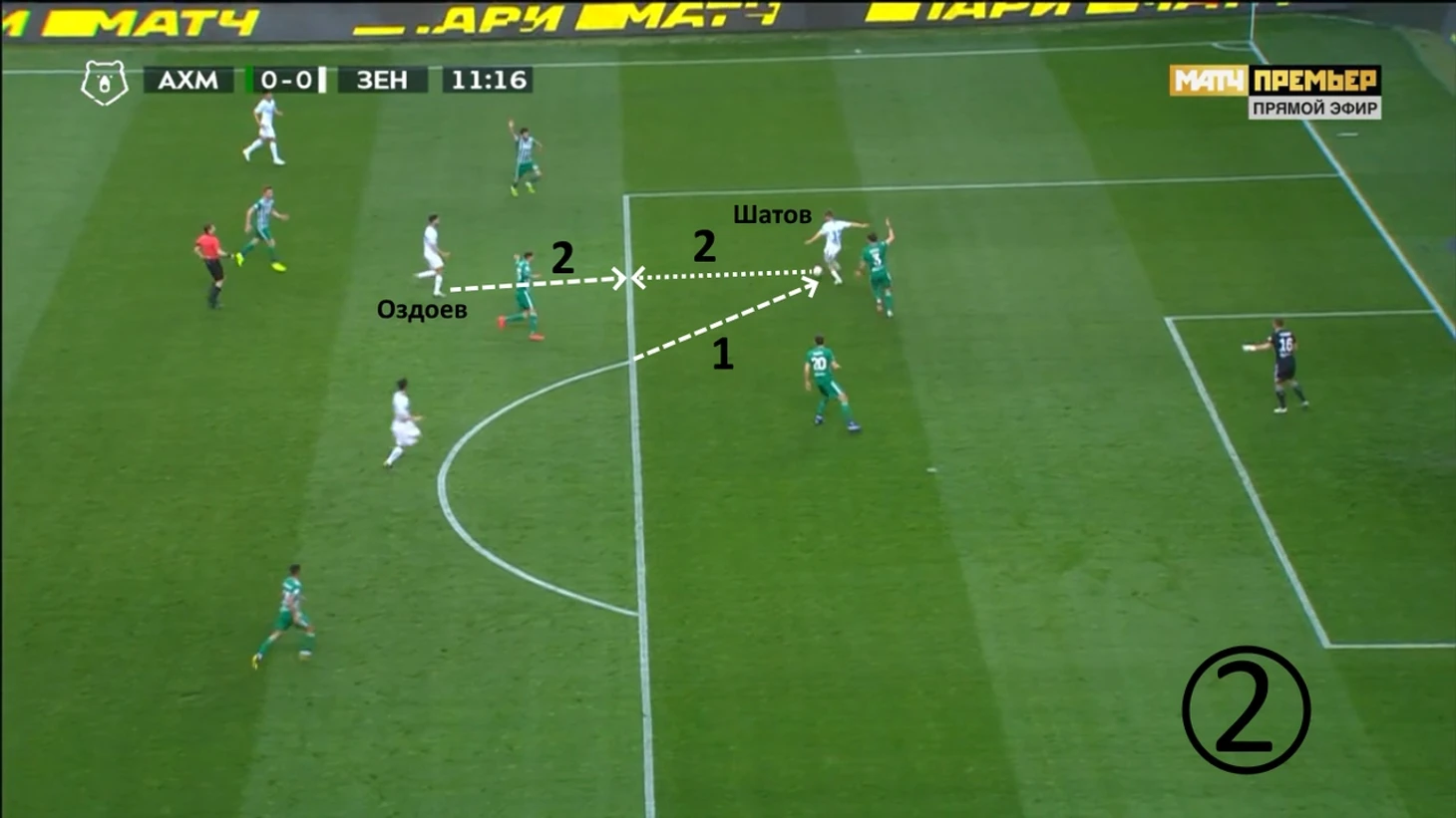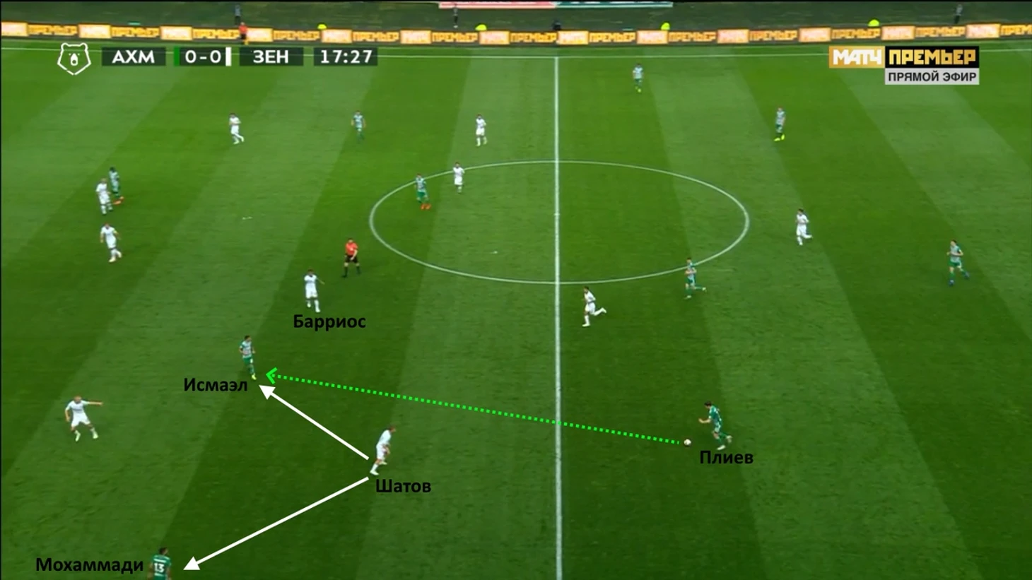 Из-за того, что Шатов расположился узко, приготовился забегать за спину, левому латералю «Ахмата», Мохаммади, приходится ориентироваться на Олега. При диагональном переводе «Зенитом» мяча на правый фланг на принимающего мяч Смольникова вынужден выдвигаться Исмаэл.