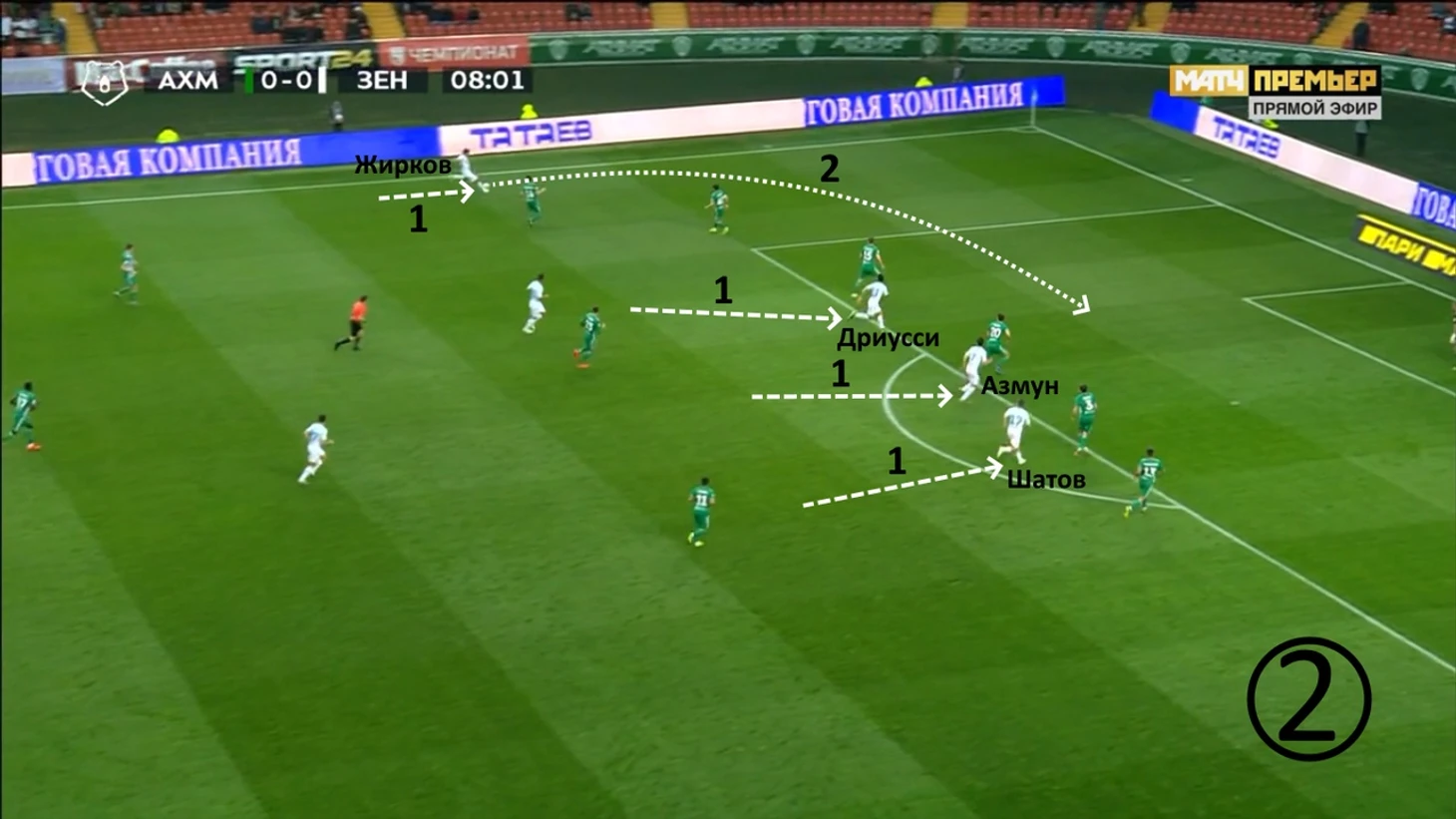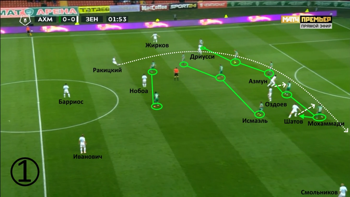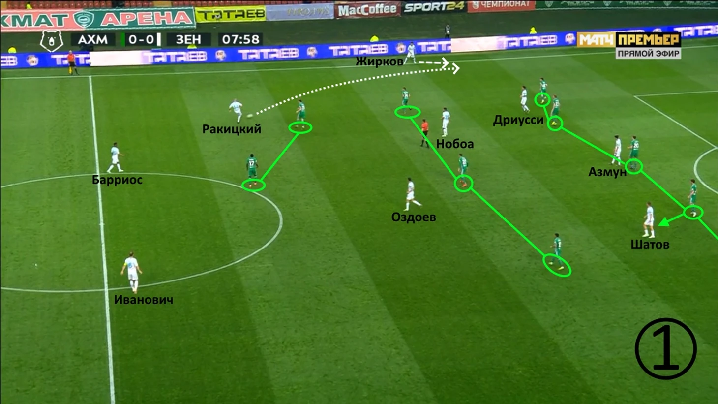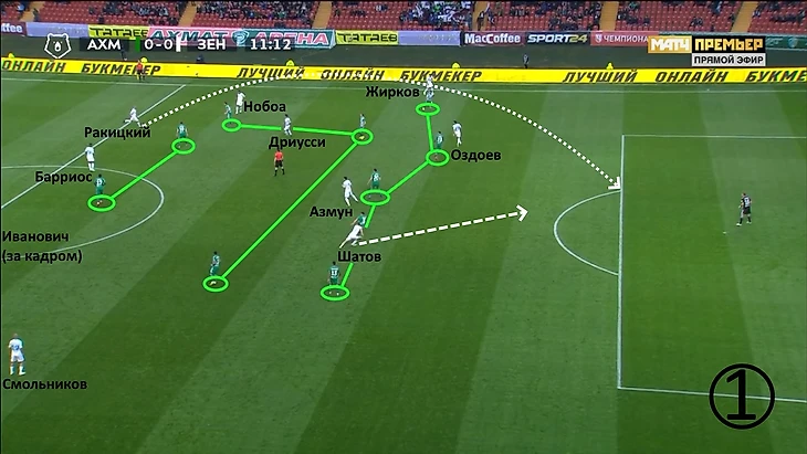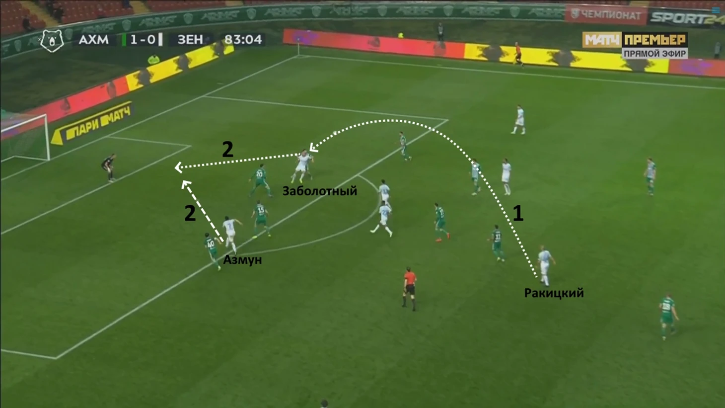 Основные варианты розыгрыша исходили из сценария, при котором Ракицкий имеет достаточно времени на мяче, а «Ахмат» располагается в низком блоке. Структура у атак «Зенита» была всегда примерно одна и та же: левый фланг перегружен, атакующая группа играет компактно, ширину справа создаёт только Смольников. Атакующие паттерны, однако, были при этом разные, поэтому каждый стоит разобрать в отдельности.