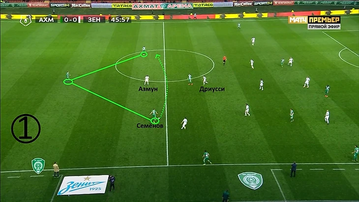 Семёнов переводит мяч правому ЦЗ «Ахмата», так как на его левом фланге всё перекрыто. Обратите внимание на расположение Азмуна и Дриусси относительно друг друга.