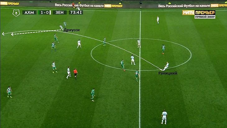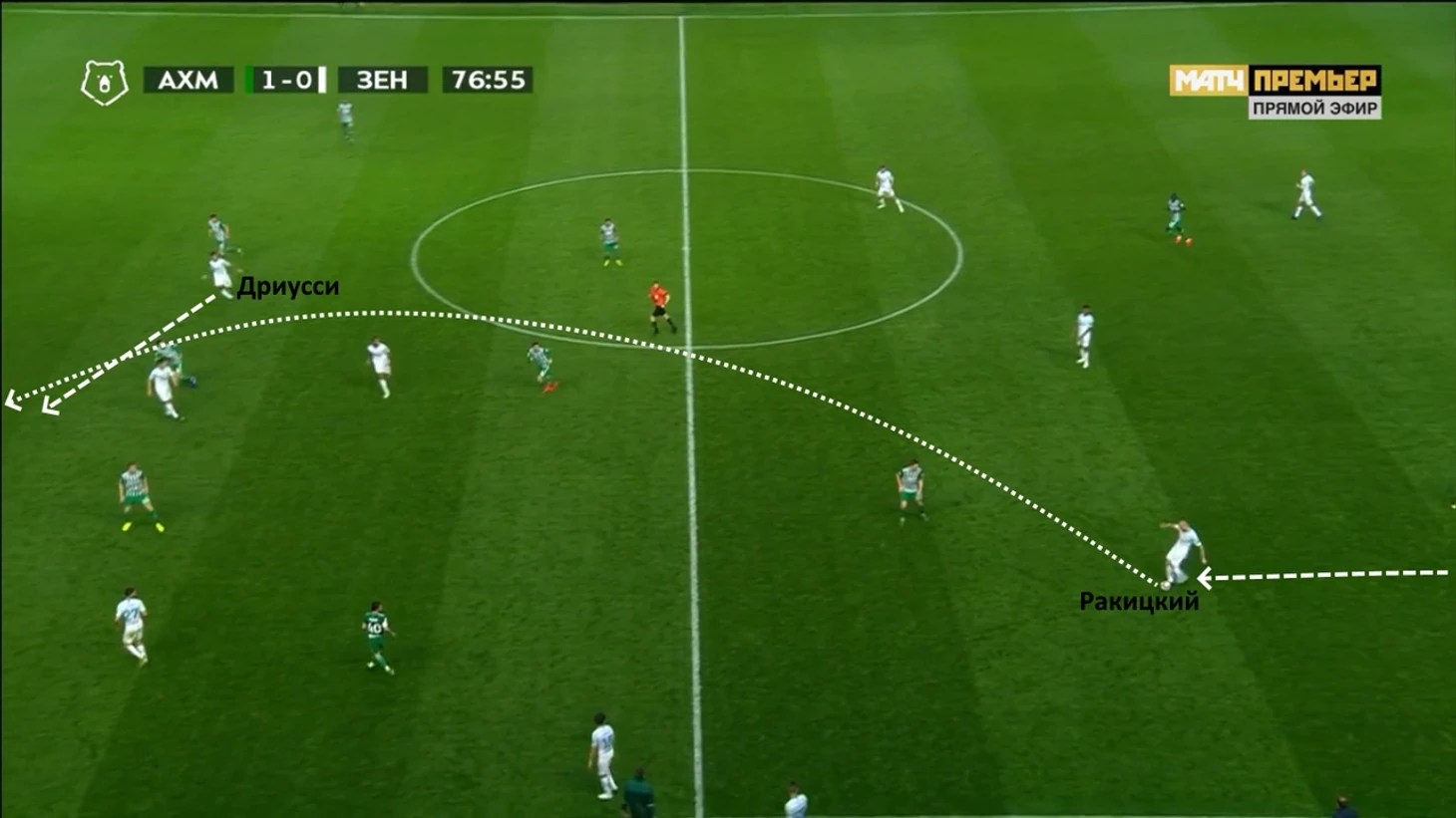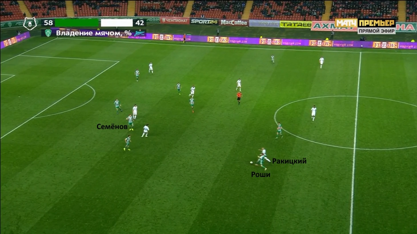 Варианты розыгрыша мяча у «Зенита» действительно были подготовлены, но проблема в том, что они не были надёжны. Во-первых, очень многое зависело от свободы Ракицкого на мяче, которую Ярослав далеко не всегда получал. Во-вторых, не имея вариантов для игры между линиями в центре или полуфлангах, «Зенит» при закрытом Ракицком был вынужден атаковать с момента развития через фланги и вертикально, что в 4-3-3 работает ещё хуже, чем в 4-4-2. В-третьих, «Сине-Бело-Голубые» зависели от постоянного контроля мяча. Дело в том, что в первой линии билд-ап’а мяч у подопечных Семака не держался, поскольку Оздоев часто поднимался к линии офсайда, а перекрыть одного Нобоа «Ахмату» было несложно. Соответственно, атаковать почти всегда приходилось одним темпом, выполняя малое количество передач. Понятно, что не доведённые до автоматизма комбинации проходить будут не так часто, поэтому важно, чтобы их количество было бы выше. Именно поэтому «Зениту» было необходимо качественно контрпрессинговать соперника, быстро возвращать себе владение, чтобы раскатывать новые атаки, а получалось это далеко не всегда.