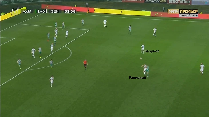 Барриос вместо того, чтобы бежать закрывать Исмаэла (что и должен тут делать), передвигается трусцой, показывает Шатову, чтобы тот закрывал линию передачи на него. Олег же был ориентирован на то, чтобы блокировать линию паса на Мохаммади (правильно), поэтому среагировать на пас от Плиева не смог. В итоге «Ахмат» опять вскрыл линии «Зенита» довёл мяч до финальной трети.