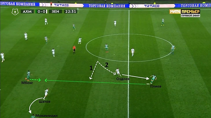 Оздоев вместо того, чтобы просто перекрыть полуфланг (стрелка 1), решил зачем-то выброситься на Плиева (стрелка 2), на которого не мог уже оказать должное давление. В зону за спиной Магомеда сразу опустился Мбенг, принял там мяч под давлением Шатова, который, изначально правильно ориентируясь на Мохаммади, едва успел сфолить на форварде «Ахмата», чтобы тот не смог продвинуть мяч дальше.