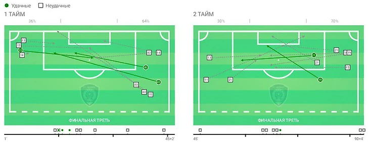 Одной из причин того, что подопечные Семака владели мячом не так много, как хотелось бы (после 57% в первые 15 минут к концу первого тайма значение упало до 41%), не только потому что перестал удаваться контрпрессинг, но и из-за плохой игры в позиционной защите.