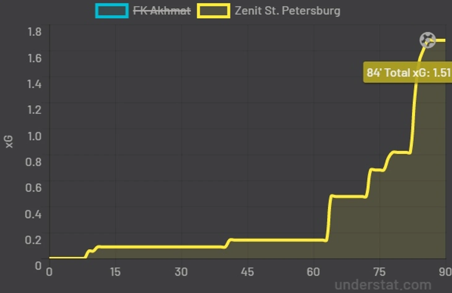 Если посмотреть график созданных xG «Зенитом» и сопоставить с таймкодами на скриншотах выше, то нетрудно понять, кто именно создал самые опасные моменты команды в матче.