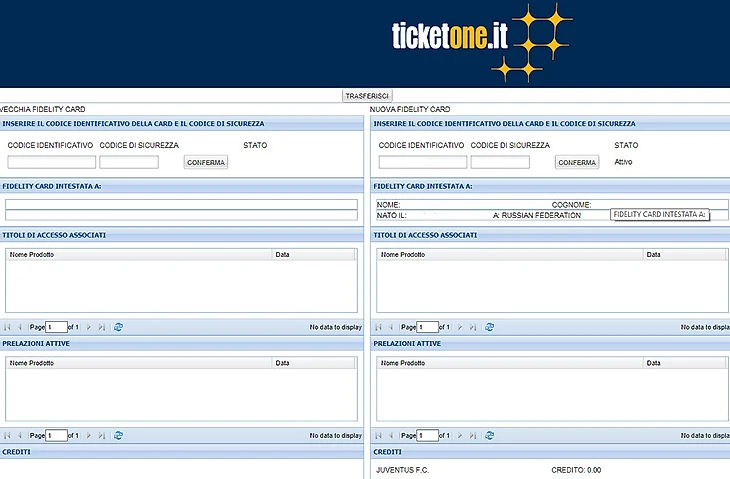 ), где нужно ввести номер своей карты в графу CODICE IDENTIFICATIVO, а ПИН-код в графу CODICE DI SICUREZZA. Далее жмём CONFERMA и в графе STATO должно высветиться Attivo и подгрузиться ваши данные. Если это произошло, то вас можно поздравить.Вводить данные нужно в правую часть. Но если это не первая ваша карточка, а ранее у вас была TESSERA DEL TIFOSO, то заполнять, видимо, нужно левую часть.