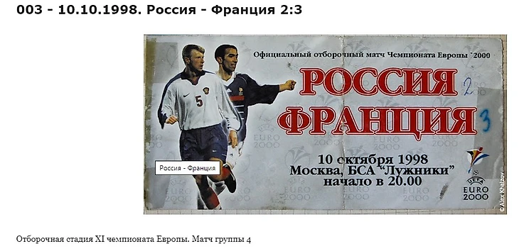 Несколько примеров. 003 - 10.10.1998. Россия - Франция 2:3 с красивым билетом
