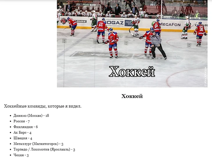 Профайлы игр содержат фотографии моих билетов, статистику матча, краткий видеообзор и/или матч целиком, а иногда ещё какие-то дополнительные материалы.