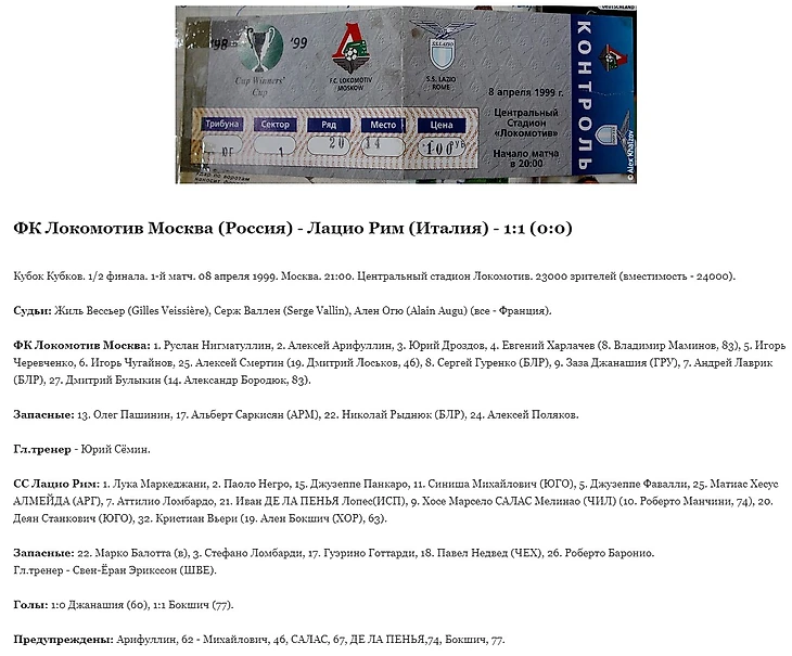 А как вам полуфинал еврокубка за 100 рублей? Это я про 016 - 08.04.1999. Локомотив - Лацио 1:1.