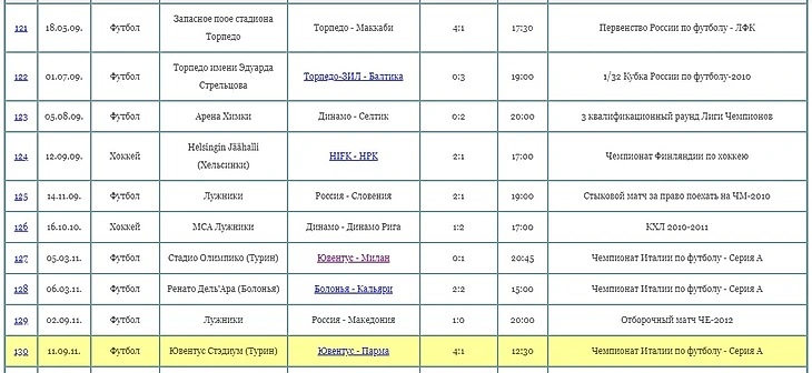 Есть немного другой вариант таблицы, где отображены только футбольные игры.