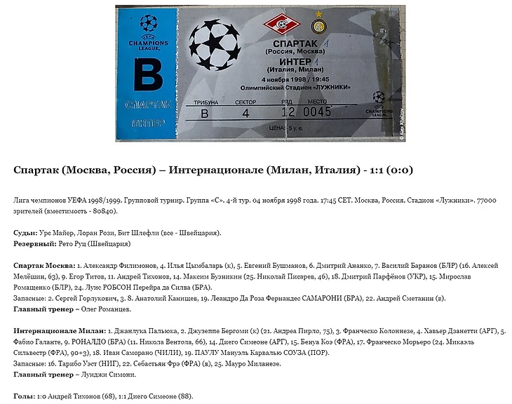 Или матч Лиги Чемпионов, на который можно было сходить за 5 баксов — 004 - 04.11.1998. Спартак - Интер 1:1