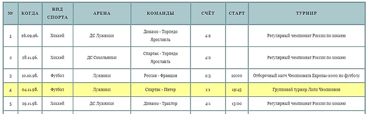 В первую заносил номер похода (т.к. бывало, что смотрел несколько матчей за день на одной арене), вид спорта, стадион, где проходил матч, а также названия противоборствующих команд и итоговый счёт. Во второй части тетрадки писал время начала матчей и их статус.