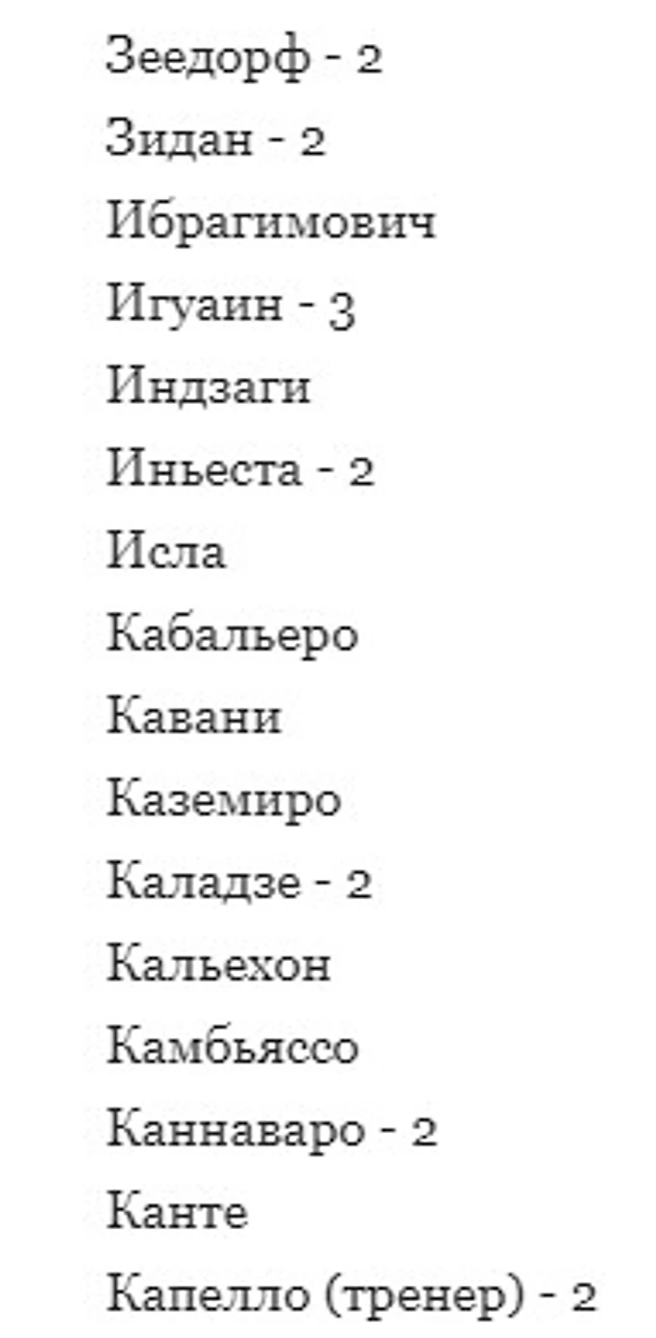 Также есть страница, где в алфавитном порядке перечислены все известные иностранные футболисты, игру которых мне довелось увидеть (с отметкой о количестве раз, что их видел).