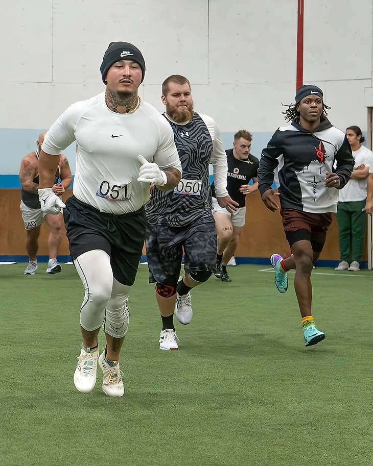 В конце дня был тест игровых навыков. Я планировал играть Ди-Тэклом, но мне подсказали что я маловат (вес Ильи 125 кг, при росте 188 см - прим. автора). И так случилось, что центр из Канады спустя пару розыгрышей получил повреждение. В итоге почти всю третью часть трайаута играл центром. Здесь рассчитывал, что всех перееду, но пришлось попотеть. Было непривычно играть в футбол без каркаса и шлема.