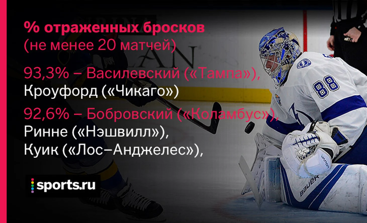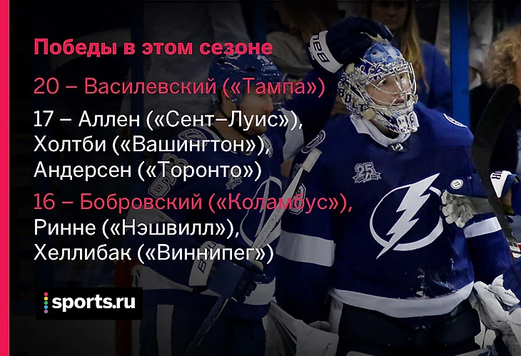 Первый сезон в роли безоговорочно основного голкипера «Лайтнинг» Василевскому удается. Команда в огне и часто выигрывает, Андрей играет много и действует в целом очень эффективно. Сейчас он является несомненным кандидатом на «Везину». А как иначе, если по трем из четырех основных вратарских показателей статистики Василевский занимает чистое первое место?