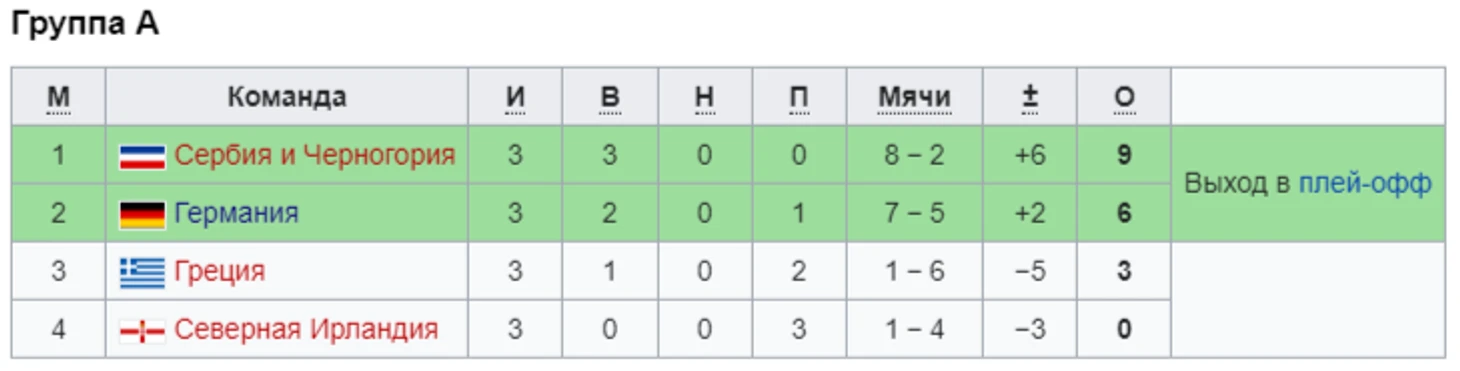 1-й тур: Сербия и Черногория 4:2 Германия, Северная Ирландия 0:1 Греция.
