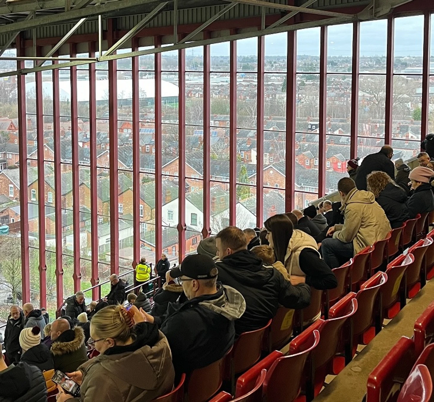 И вот я на той самой трибуне Holte End, за воротами. Первое что бросается в глаза, это огромное прозрачное окно, через которое видно город, и в котором отражается футбольное поле. Причем, чуть ниже находится просто проем безо всякого стекла, и я подозреваю, что бедные жители близлежащих домов прекрасно осведомлены обо всем, что происходит во время матчей.