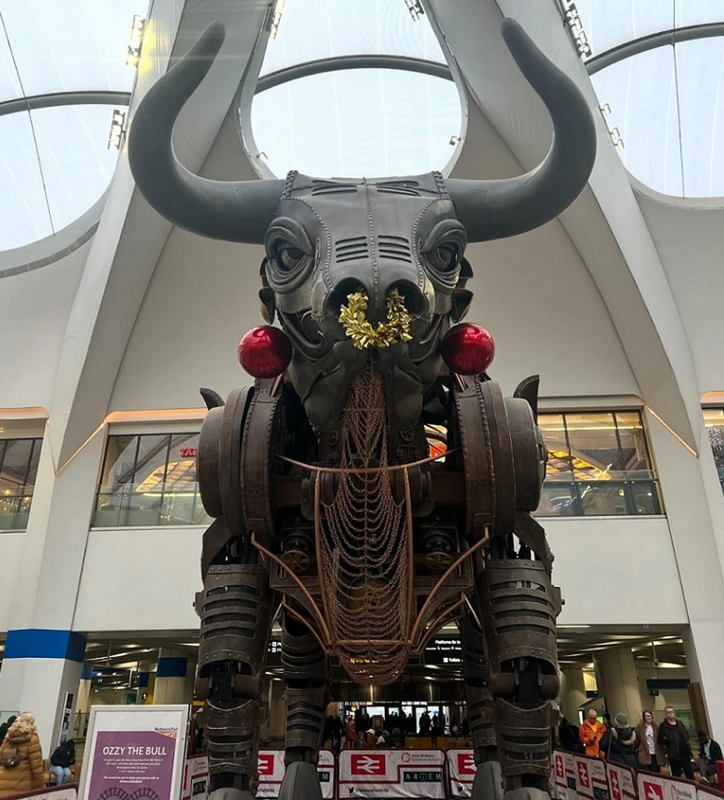 На центральном вокзале города меня встречает вот такой бык. Оззи, 10 метров в высоту, был официальным талисманом игр стран Содружества, прошедших в Бирмингеме в 2022 году (возможно, вот куда ушли городские деньги?). Имя он получил в честь главного музыканта в истории города- было публичное голосование, и данный вариант победил с подавляющим преимуществом.