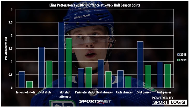 Физические данные шведа тоже не оставляют в покое. Если Элиас справляется с опасностью столкновений в отдельных играх, то что насчёт его формы на дистанции? Во второй половине прошлого сезона у Петтерссона появились и статистические, и игровые проблемы. В первых 36 играх сезона-2018/19 он набрал 39 очков, в следующих 35 играх – 27. Уменьшилось количество бросков из опасной зоны (slot shots), сократилось число ключевых передач. Объективно, Петтерссон не сумел сохранить ту форму, что была у него осенью в дебютном сезоне в НХЛ.