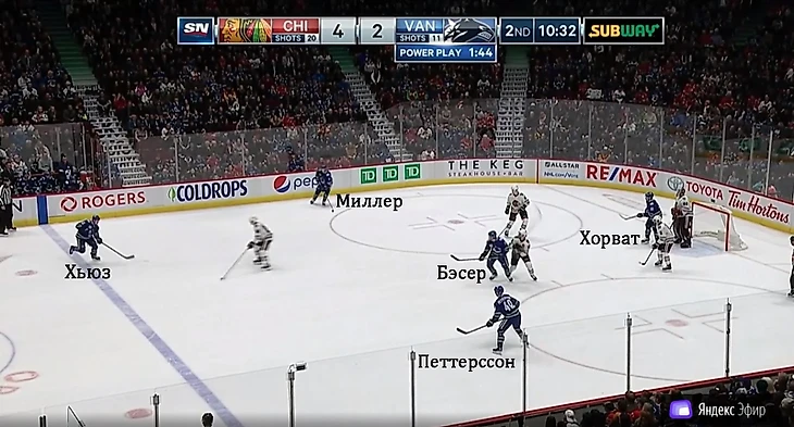 Казалось бы, Петтерссон должен быть и главным плеймейкером, и главным снайпером спецбригады. В действительности все немного иначе: позицию ведущего пакмувера занимает Куинн Хьюз. Молодой американец дирижирует игрой «Ванкувера» в большинстве, а Петтерссону отводится роль флангового пакмувера. Куинн и Элиас обеспечивают постоянное движение шайбы, пока Миллер и Босер ищут пространство для завершения атаки, а Хорват создает трафик на пятаке.