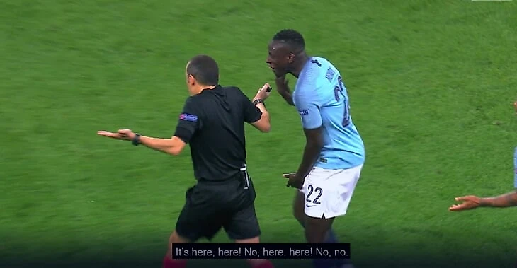«Там было небольшое касание руки, а потом ноги», – говорят в наушник Джюнейту Чакыру из ВАР-центра. – Но касание ноги точно было, точно было. Хочу тебе показать этот момент, потому что там, может быть, была рука».