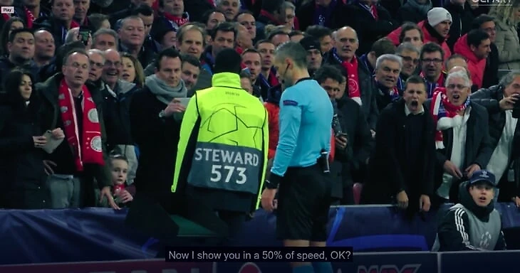 «Посмотри, когда гол был забит, игрок «Аякса», который столкнулся с вратарем, был в офсайде», – говорят Скомине в наушник. – Сейчас я тебе покажу эпизод с замедлением 50%, ок?»